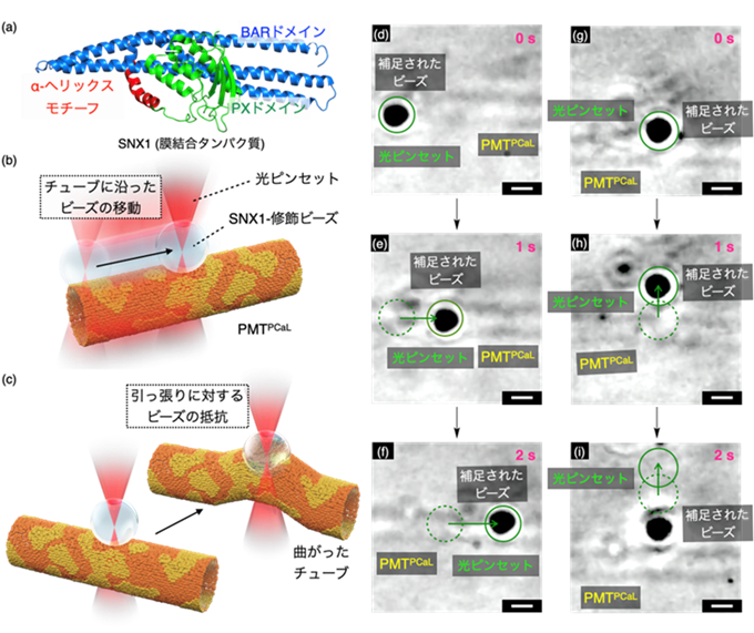 図3 (a) SNX1のリボン構造、BARドメイン (水色)、PXドメイン (緑)、α-ヘリックスモチーフ (赤) で構成される。(b, c) 光ピンセットを用いた、PMTPCaLに沿った長軸方向 (b) および垂直方向 (c) への、SNX1被覆ポリスチレンマイクロビーズの引っ張り試験の模式図。(d–i) PMTPCaL ([DOPC]/[DPPC]/[Chol]/[PCaL] = 40/40/20/1) に付着したSNX1コーティングマイクロビーズを光ピンセットを用いて長軸方向 (d–f) および垂直方向 (g–i) へ移動させた際の、引っ張り試験の明視野顕微鏡写真。スケールバー:2 μm。
