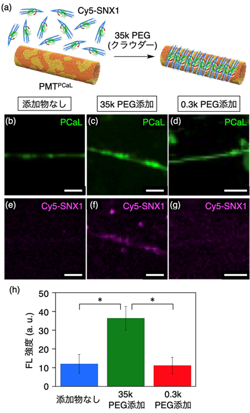 図4 (a) 蛍光ラベルしたSNX1 (Cy5-SNX1) のPMTPCaL上への結合の模式図。(b–g) 緩衝液中で、Cy5-SNX1 (1.4 μM) を加えた後のPMTPCaLの共焦点顕微鏡観察結果。添加物なし (b, e)、35k PEG (10 wt%) (c, f)) または0.3k PEG (10 wt%) (d, g) を添加した際の顕微鏡画像。PCaL (b–d、λex = 488 nm、緑) およびCy5-SNX1 (e–g、λex = 638 nm、マゼンタ) の局在を示す。スケールバー:5 μm。(h) PMTPCaL上のCy5-SNX1の蛍光強度 (青:添加物なし、緑:35k PEG (10 wt%) 添加、赤:0.3k PEG (10 wt%) 添加)。