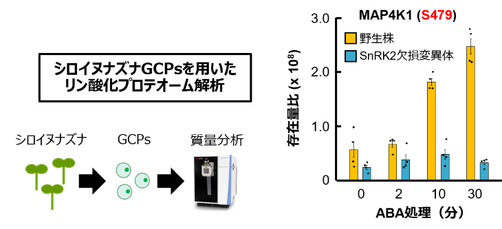 シロイヌナズナから精製した孔辺細胞プロトプラスト(GCPs)を用いたリン酸化プロテオーム解析により、MAP4K1の479番目のセリン(S479)が、ABAおよびSnRK2に依存してリン酸化されることが明らかになりました。