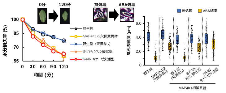MAP4K1と、それとよく似た働きをもつMAP4K2の両方が欠けた植物では、植物ホルモンABAが働いても気孔をうまく閉じることができません。そのため、葉から水分が多く失われ、植物は萎れやすくなります(図左)。また、この変異体に、働きが不完全なMAP4K1(リン酸化できない型や、酵素として働かない型)を戻しても、気孔を閉じる能力は回復しませんでした(図右)。このことから、MAP4K1が正しくリン酸化され、酵素として機能することが、気孔を閉じて水分を守るために重要であることが分かりました。