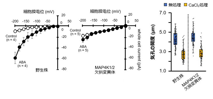 MAP4K1とMAP4K2の両方が欠けた植物では、塩化カルシウム(CaCl₂)を与えて外部からカルシウムを補うと、気孔を閉じる能力が回復し、その程度は野生型の植物とほぼ同じになりました(図左)。また、ABAの刺激によって本来働くはずの細胞膜のカルシウムチャネルがうまく機能せず(図右)、その結果、気孔を閉じる反応が抑制されることが分かりました。このことから、MAP4K1/2は、ABAによるカルシウムの流入を介した気孔閉鎖に重要な役割を果たしていると考えられます。