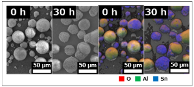 北海道大学で開発した、相変化物質としてスズを内部に用い、カプセル材としてα-アルミナ粒子を用いて液体時に溶けだすのを防ぐために保護したMEPCM粒子層(Sn@α-Al2O3、平均粒子径31 μm, 融点239 ℃)を、東京農工大学で流動化し、約100-300℃において安定して迅速な蓄熱・放熱が可能であることを実験的に明らかにしました。また、40時間まで流動化したときの粒子の様子と蓄熱性能について詳細を明らかにしました。