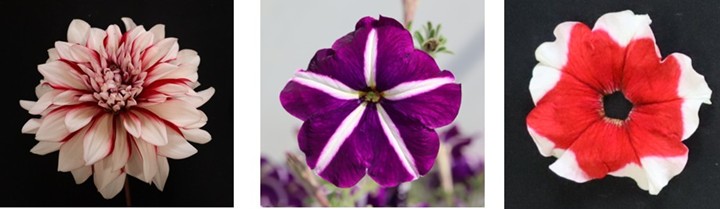 図1:本研究に用いた2色咲品種のダリアおよびペチュニアの花:左からダリア「結納」、ペチュニア星咲品種「カーペットブルースター」、ペチュニア覆輪品種「バカラレッドピコティー」