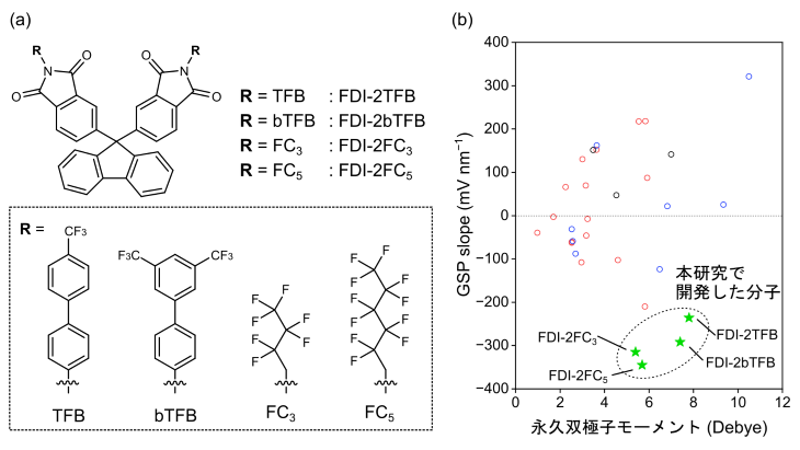 図1 (a) 本研究で開発したFDI極性分子の化学構造、(b) 極性分子の永久双極子モーメントと蒸着薄膜のGSP slopeの関係。GSP slopeは薄膜の単位膜厚あたりの表面電位であり、配向分極の強さを表す指標である。図は掲載論文をもとに作成したものである。
