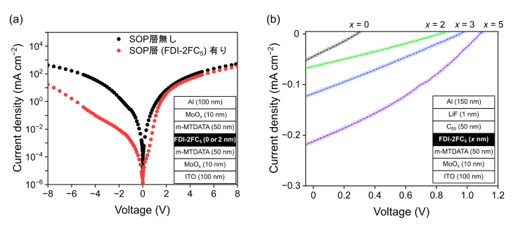縦型有機半導体デバイス内の有機薄膜界面において、数nm程度の膜厚のSOP層が整流作用の制御に有効であることを明らかにしました。整流作用とは多くの電子機器で不可欠な、電流を一方向にのみ流す効果であり、pn接合ダイオード等で一般的に観測されます。本研究では、OLEDなどに用いられる正孔輸送性有機薄膜とSOP層を積層(正孔輸送層/SOP層/正孔輸送層の構造)することで整流作用が生じることを明らかにしました(図2(a))。整流作用の極性はSOP層の分極極性に依存することも確認しており、有機半導体デバイス内で電荷の蓄積・再結合の位置を自在に制御することにも応用できると期待できます。