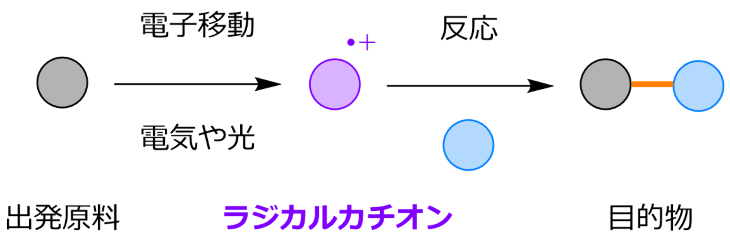 これに対し近年では、電気や光のエネルギーによる「電子移動」を利用し、常温・常圧という穏やかな条件で分子を活性化する手法が注目されています。この手法では、安定な化合物から電子を一つ取り除くことで、「ラジカルカチオン」と呼ばれる極めて反応性の高い活性中間体を生み出すことが可能です(図2)。しかし、このラジカルカチオン種を自在に制御・利用できる反応例は依然として限られています。したがって、新たなラジカルカチオン種を反応系に導入し、その反応性を開拓することは、未踏の分子構造へアクセスするための極めて有効なアプローチとなります。