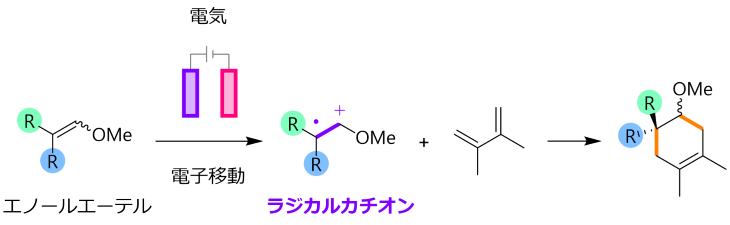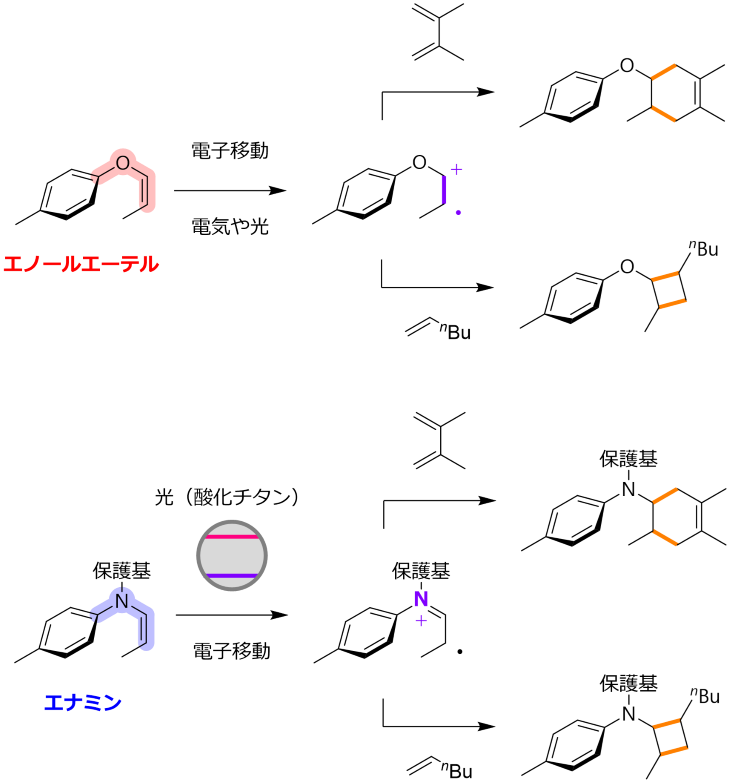 一方、エノールエーテルの酸素原子を窒素原子に置き換えた「エナミン」は、医薬品合成等において極めて重要な構造モチーフですが、そのラジカルカチオンを活性中間体として制御・利用する反応例は未だ限定的でした。