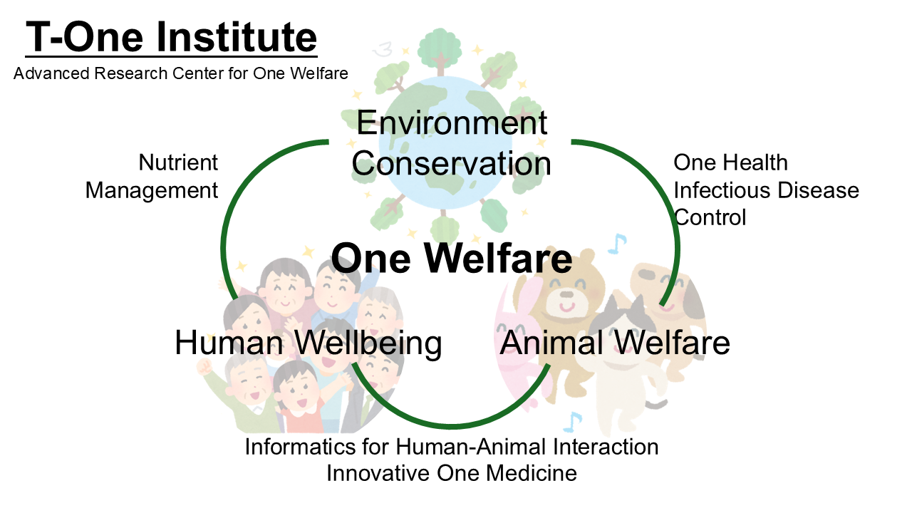 ワンウェルフェア高等研究所(略称:T-One)は、ヒト・動物・自然環境を医療・健康・福祉の観点から一体的に捉える「ワンウェルフェア」分野において、頭脳循環の国際的ハブとなる組織です。研究所には、「革新医療研究領域」「ワンヘルス感染制御研究領域」「動物共生情報学研究領域」「栄養塩マネジメント学研究領域」の4領域を設けています。また、欧州や米国などに海外ブランチを設置し、海外の大学・研究機関と連携して世界水準の研究拠点を形成します。国際ネットワークの強化を通じ、東京農工大学が強みとする獣医学・工学・農学を基軸に、分野横断的な科学と技術の融合による研究開発を推進し、地球規模の課題解決に貢献します。
