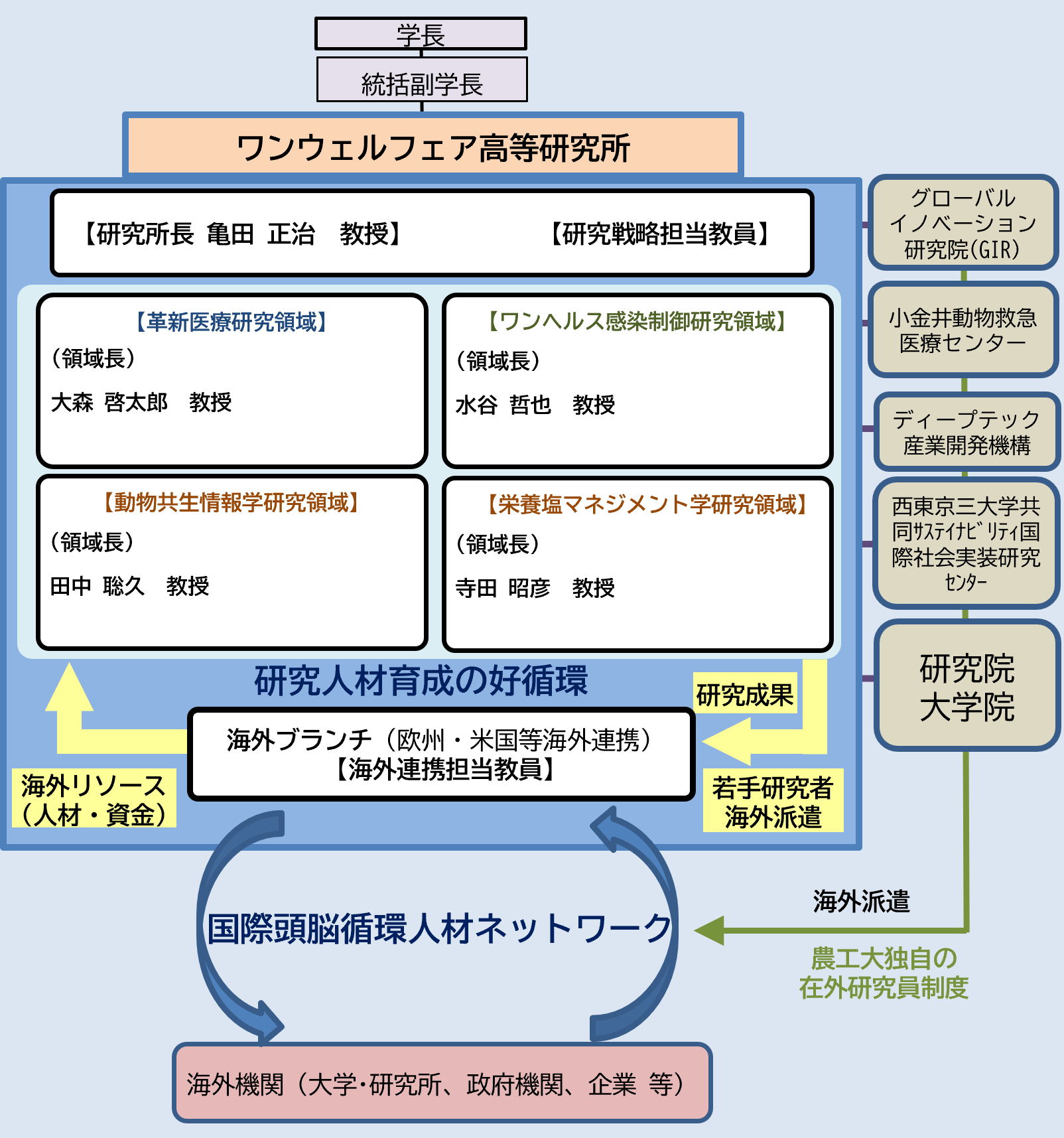 本研究所は、GIRで進めてきたグローバルリサーチハブ(GRH)事業の2拠点である「動物共生情報学」「栄養塩マネジメント学」をコアに、獣医工連携の2領域「革新医療」「ワンヘルス感染制御」を加えた4つの領域の研究開発を推進します。研究領域ごとに海外連携担当の研究者が駐在する海外ブランチを整備し、本学の若手研究者を次々に海外派遣することにより、国際頭脳循環人材ネットワークを構築します。これらを通じて、農工大型「ワンウェルフェア」研究開発の国際的求心力を高め、海外大学・研究機関・現地企業等との国際共同研究及び産学連携(外部資金の獲得)を活性化します。